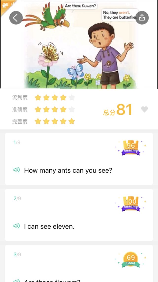 掌上泡泡APP的配音作业允许孩子反复听读同一句话,读音越接近标准发音,分数越高。当孩子们在不断尝试中刷新自己的分数记录,学习的满足感和自信心随之积累,学习兴趣自然与日俱增。